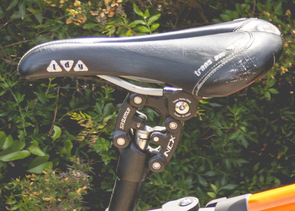 Este da Suntour tem uma curiosidade. A suspensão não funciona na direcção do eixo do espigão, mas sim fazendo uma espécie de circunferência em volta do eixo da pedaleira. Em teoria este sistema tenta manter a distancia aos pedais igual, tal como os sistema de suspensão traseiro das bicicletas, especialmente útil em subidas íngremes. Além disso ajuda a evitar possíveis lesões nos joelhos que podem surgir devido a constante alteração da distancia aos pedais nos sistemas tradicionais de suspensão de espigão.