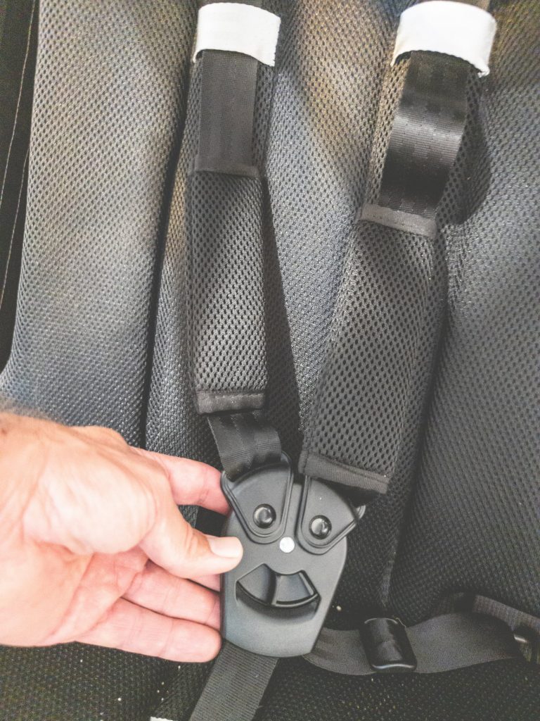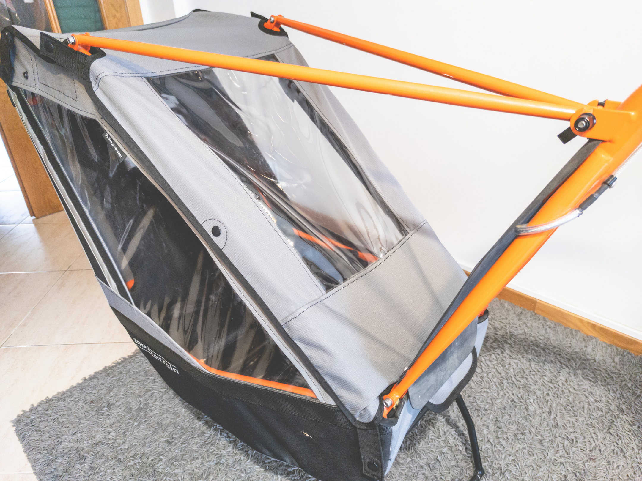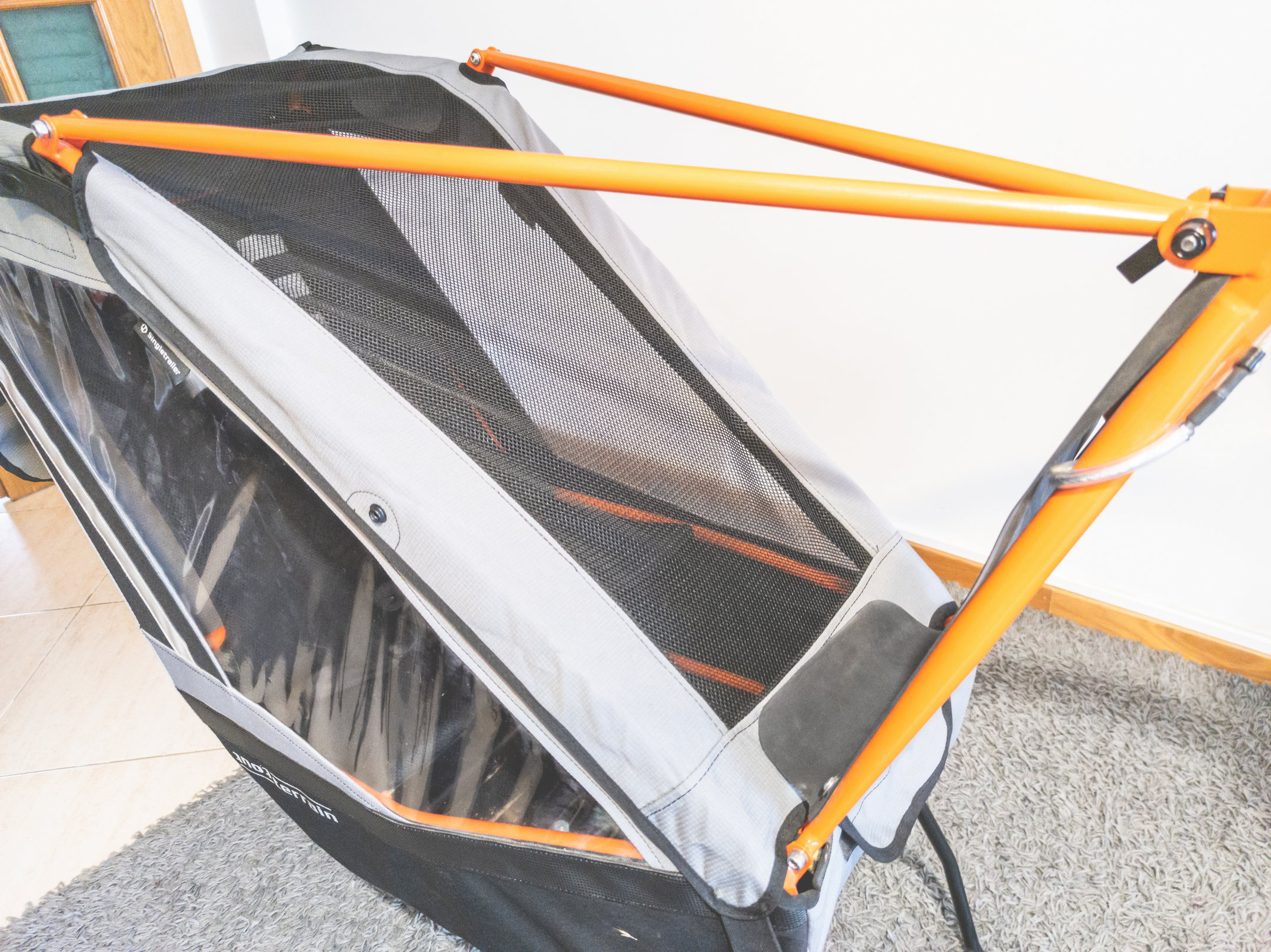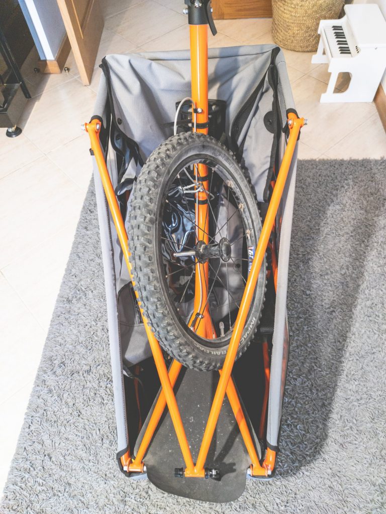 Para viagens de vários dias épreciso ter em conta que tem pouca arrumação, apenas um espaço debaixo do assento e por detrás do encosto. Nós adaptámos soluções para transportar sacos e garrafas de água na estrutura. O transporte é também um dos inconvenientes deste atrelado. Apesar de o braço se arrumar facilmente por cima do banco, a estrutura não encolhe como nos tradicionais de 2 rodas ficando sempre um pacote maior. Também não permite levar duas crianças como em algumas versões dos tradicionais.