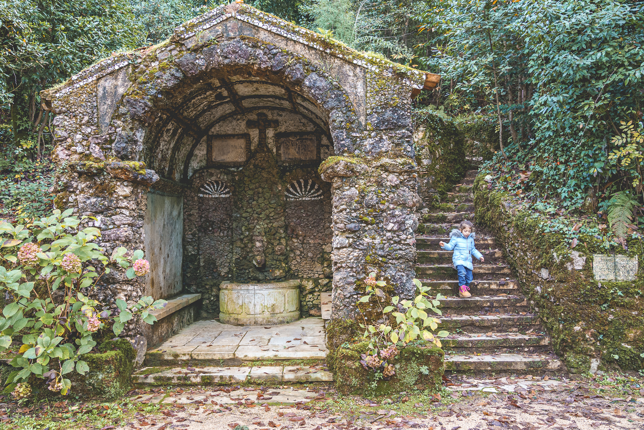 Seguimos alguns dos trilhos dos mapas, e é incrível passear por ali. Faz lembrar um pouco Sintra, pela vegetação, pelo verde, pela magia do local, pelo misticismo, não sei explicar. Está tudo muito bem indicado, com locais para nos sentarmos se necessário e com algumas mesas para podermos comer.