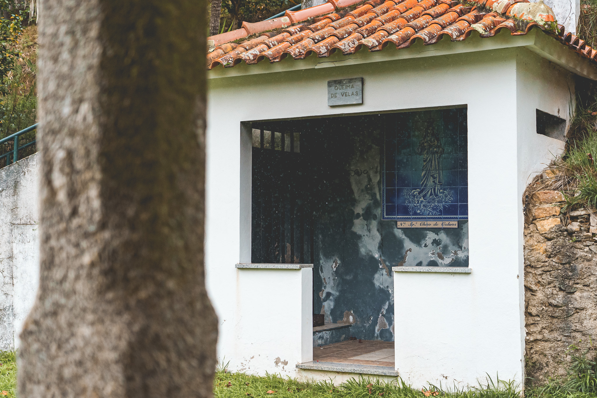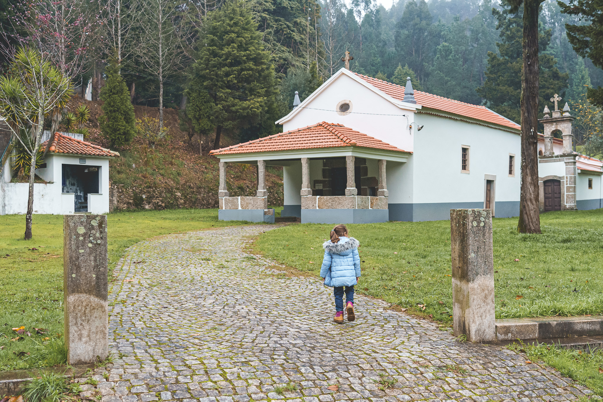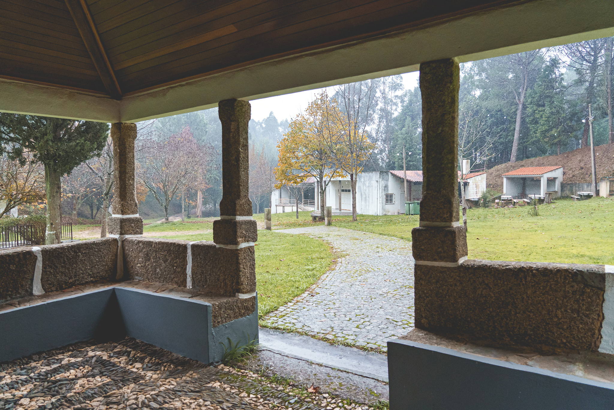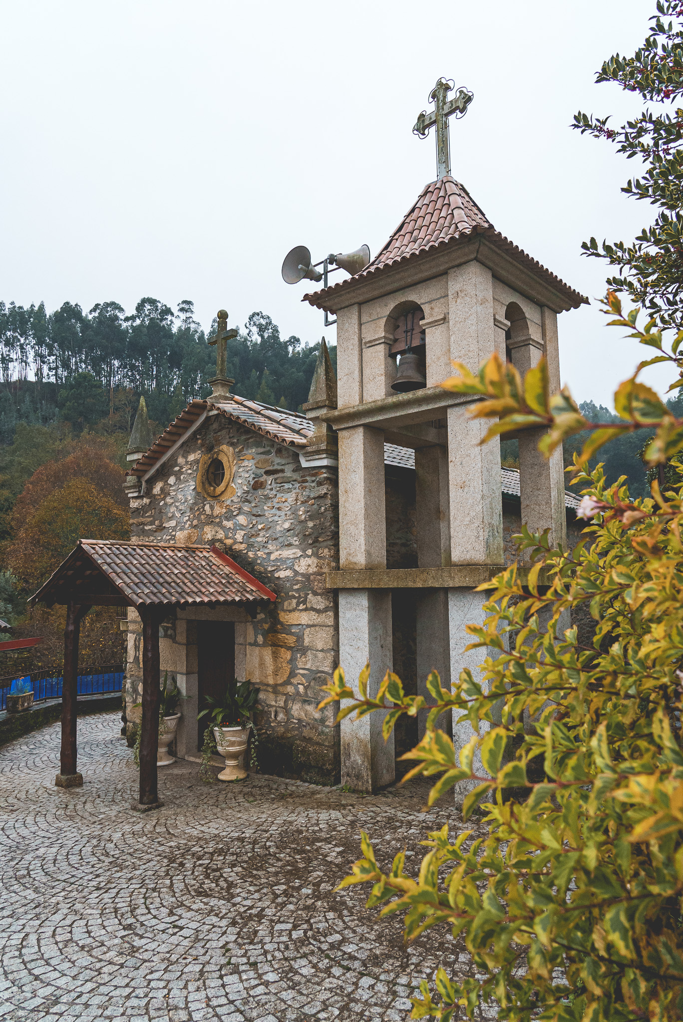 Fomos depois em direção Santuário de Nossa Senhora do Chão dos Calvos, uma zona cheia de eucaliptos e por isso com aquele cheiro característico, pelo menos para mim, das Beiras. Começou a chover imenso, mas ainda deu para ter uma ideia da beleza do local.